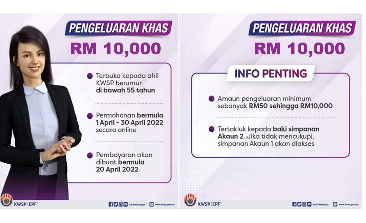 Kami tidak ada sebarang kaitan dengan agensi kerajaan atau mana-mana syarikat yang berkaitan dengannya. Mempunyai baki wang di dalam Akaun 1 dan Akaun 2 KWSP Akaun 1 boleh diakses jika tidak mencukupi dalam Akaun 2 Pengeluaran akaun 2 terdahulu sebelum mengakses simpanan. Kumpulan Wang Simpanan Pekerja KWSP mengumumkan bahawa permohonan untuk pengeluaran khas RM10000 akan dibuka kepada ahli di bawah umur 55 tahun bermula 1 April 2022 dan berakhir pada 30 April 2022 manakala tempoh pembayaran akan dilaksanakan bermula 20 April 2022.